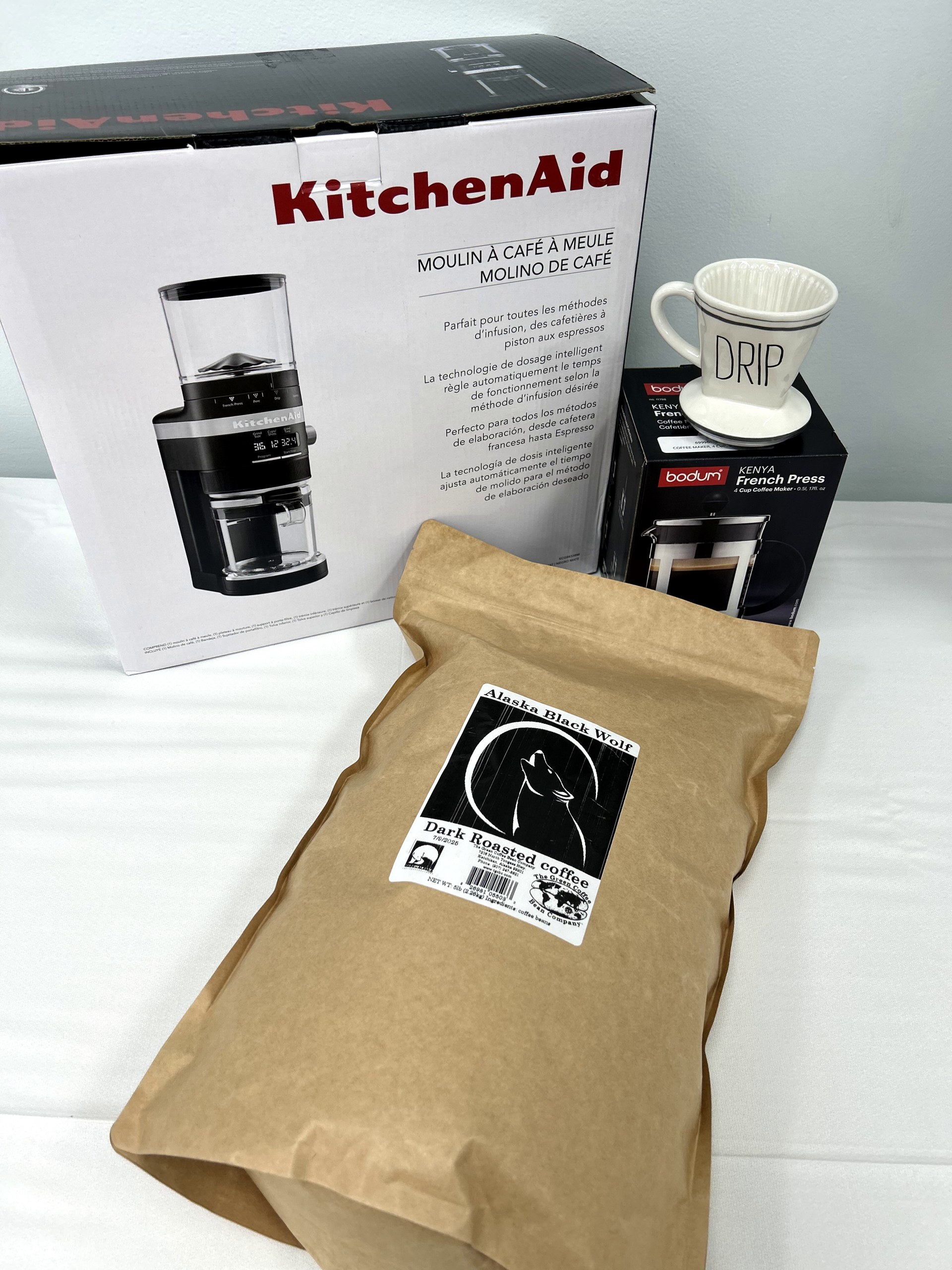 Prepare The Green Coffee Bean’s Alaska Black Wolf coffee any way you love it, first grinding it with this Kitchen Aid grinder. Use a French press or drip coffee systems as you like it!