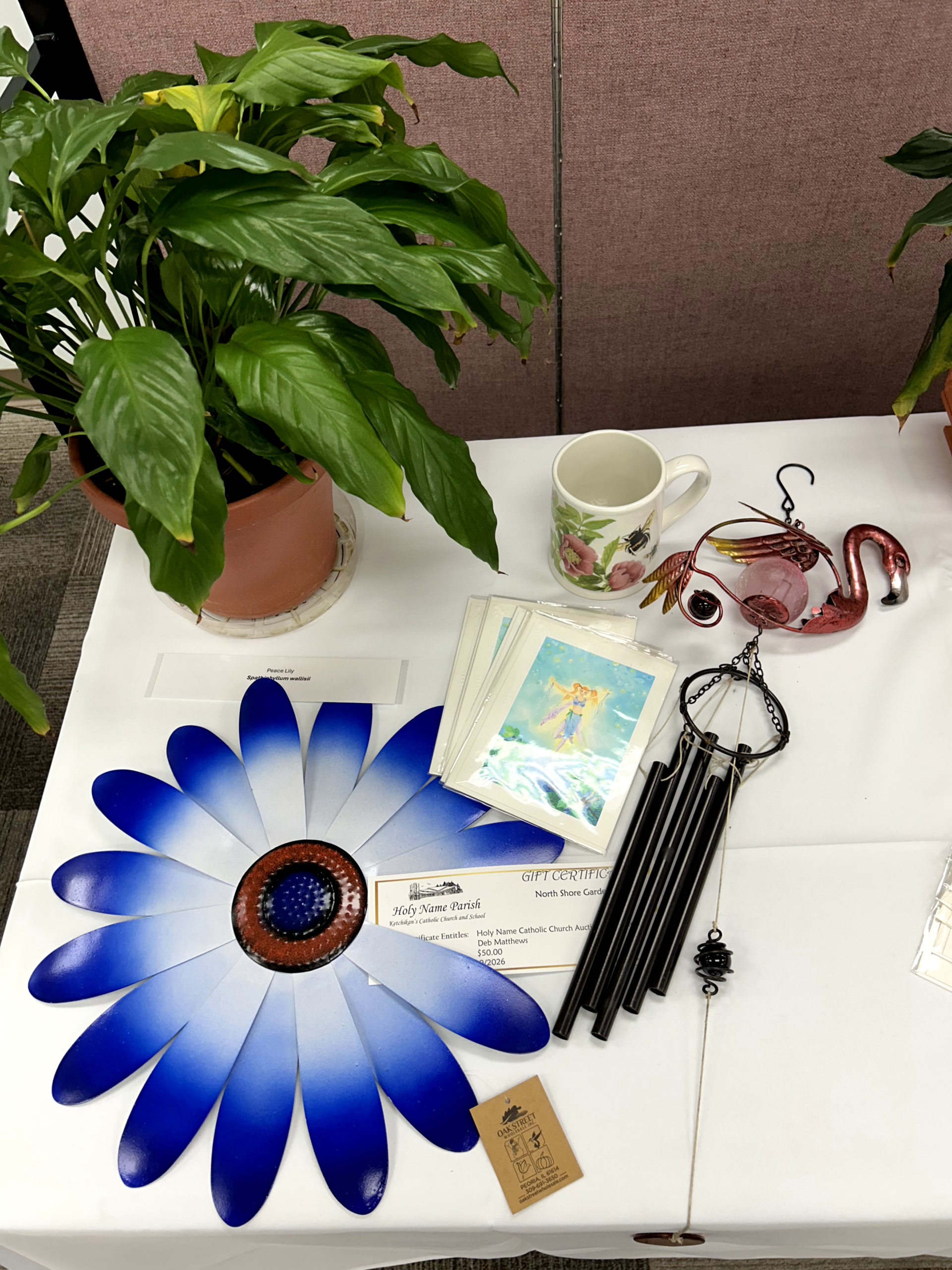 What gardener can resist a beautifully-potted peace lily for indoors while waiting for next spring so to use this gift certificate at North Shore Gardens for outdoors? As a bonus, decorate your garden with this whimsical daisy and wind chime.