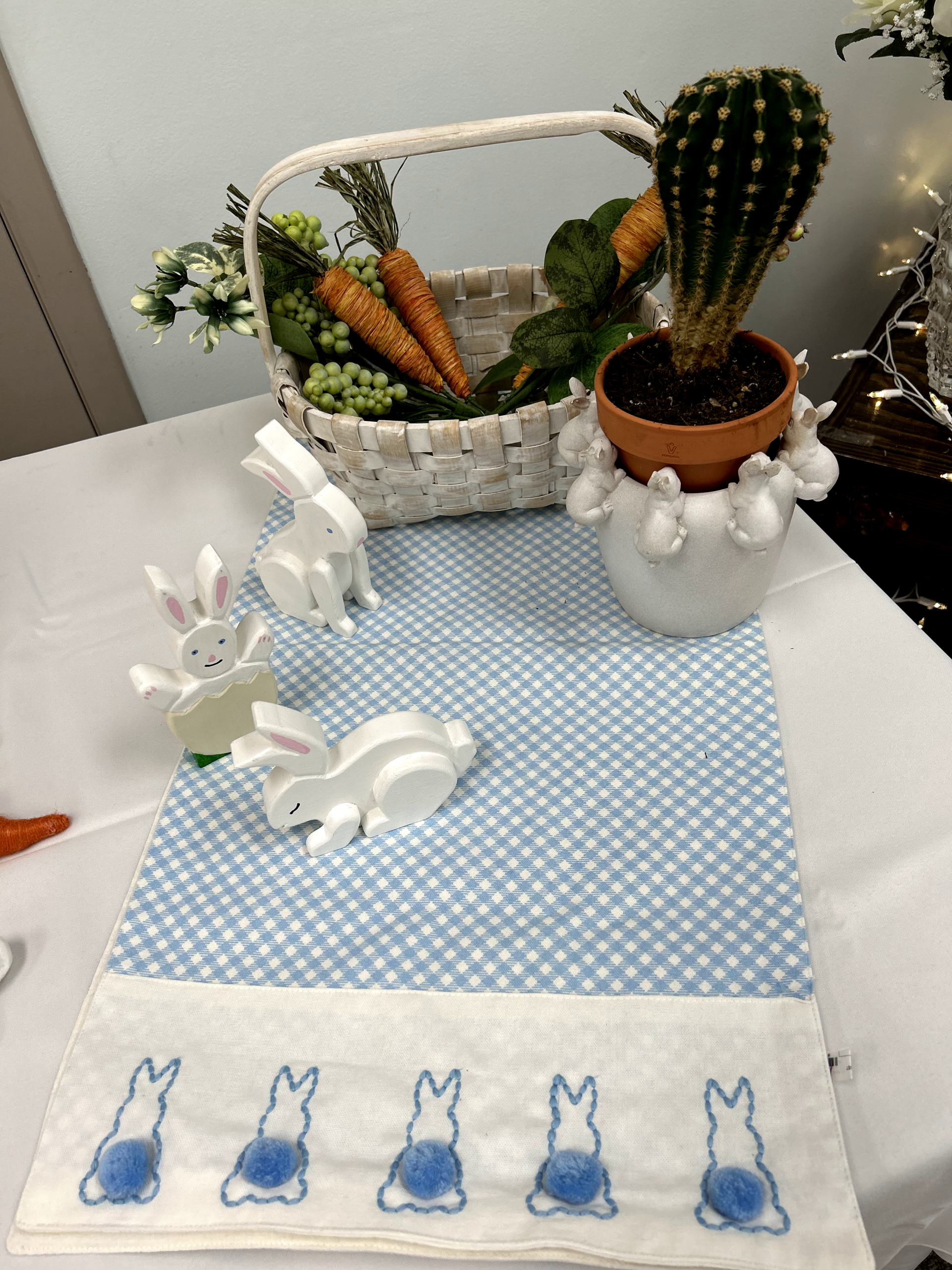 Classic Easter décor includes hand-made wooden bunnies, bunny plant holder, table runner and more.